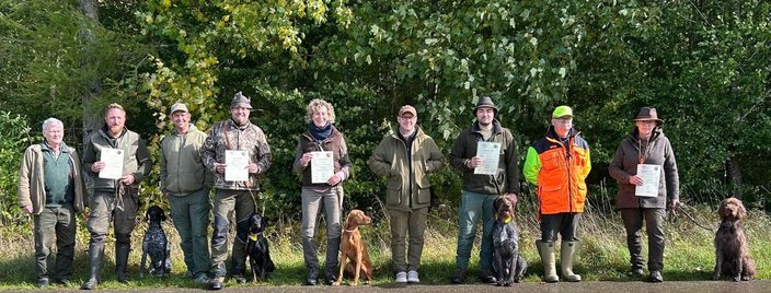 Und das mit Erfolg. Alle fünf Gespanne haben die Brauchbarkeitsprüfung für Nachsuchen im Schalenwildrevier Modul 1.1 bestanden, vier Gespanne davon auch die erweiterte Brauchbarkeit Feld und Wald (nach dem Schuss) Modul 1.2.